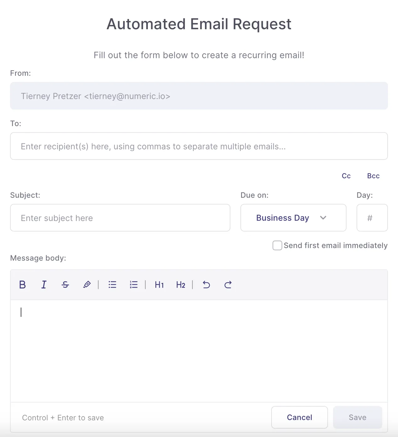 Using Numeric’s free close management tool, you can tie email automations in with your month-end checklist items and schedule tasks on specific business days.