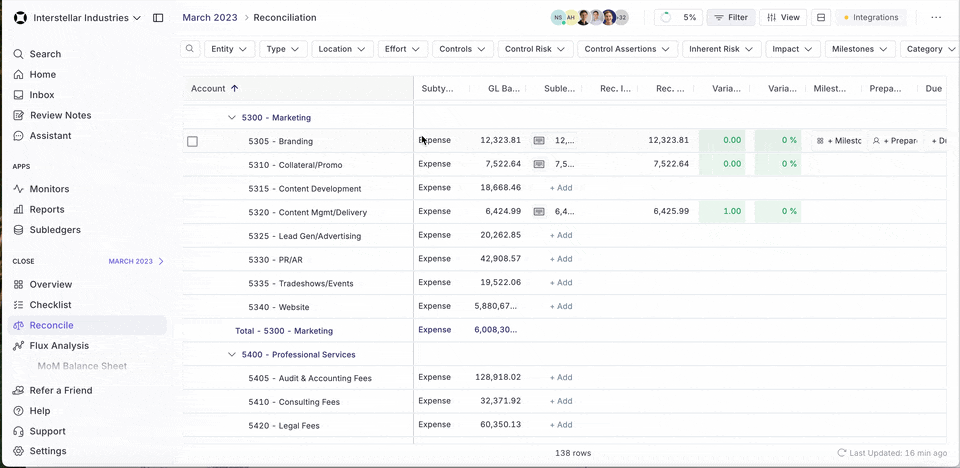 For teams looking to move away from a manual reconciliation process, close automation software is key. Since these tools automatically pull a company’s trial balance and totals from supporting sources, teams automate much of the reconciliation process and can auto-submit recons that are below the materiality threshold.