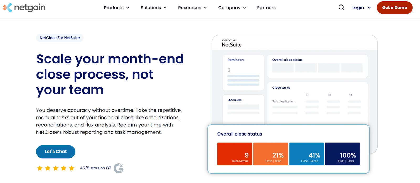 Next, NetGain is a popular alternative to BlackLine which features all the must-have tools and capabilities. Notably, NetGain is a Suite App, and close management is embedded within NetSuite.
