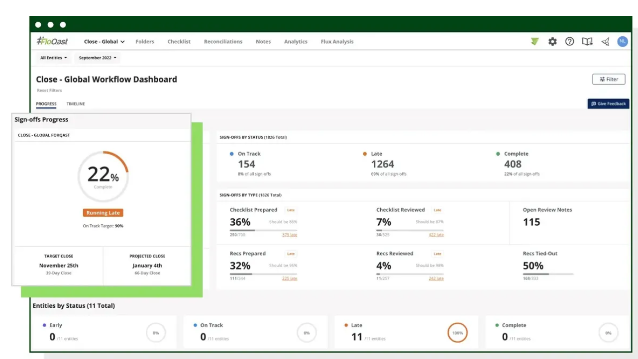FloQast Analyze gives all stakeholders visibility into the financial close process, including progress against deadlines for checklist items and reconciliations.