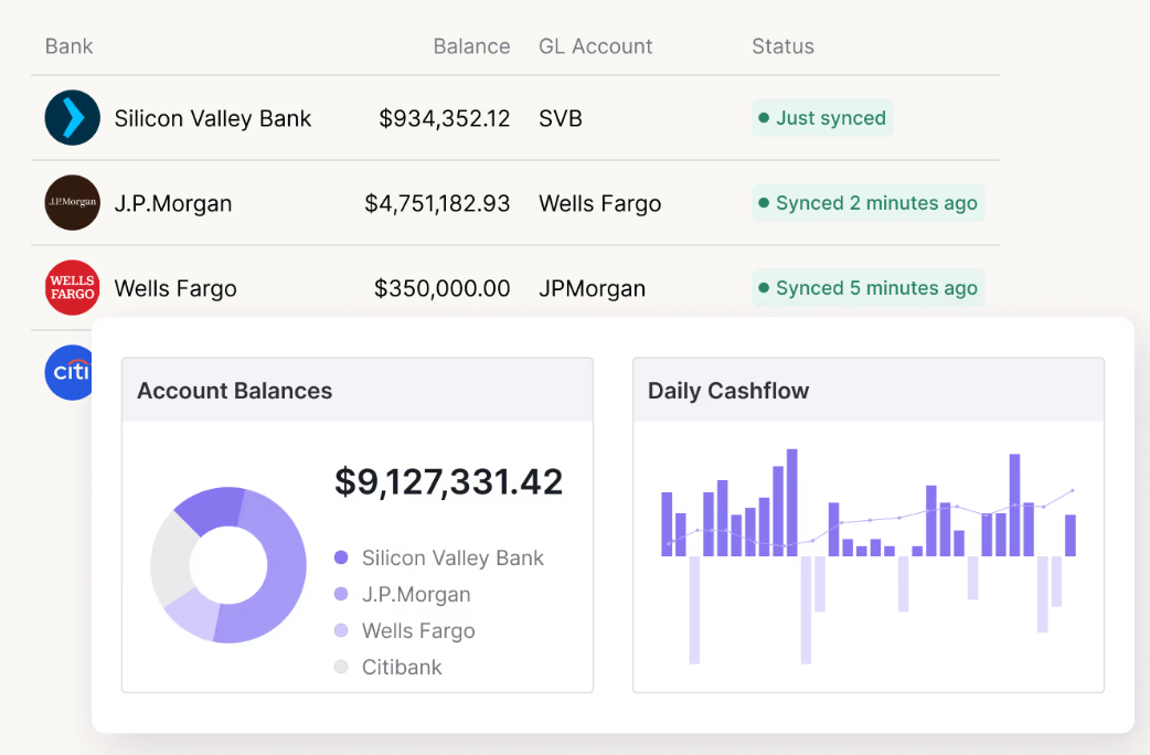 Real-time cash position visibility across all accounts, so teams can see their cash picture at any point — not just after month-end reconciliation