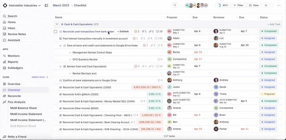 Facilitate Close Organization and Audit Readiness: Numeric helps assign tasks to preparers and reviewers while tracking all changes, comments, and submissions in a clear month-end close checklist. During audit time, auditors can log into Numeric to access a comprehensive activity trail, eliminating the need for your team to hunt down necessary documentation.