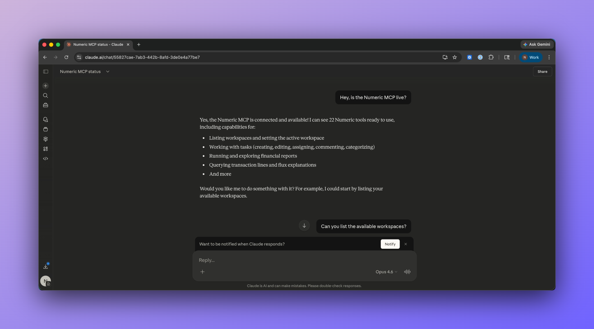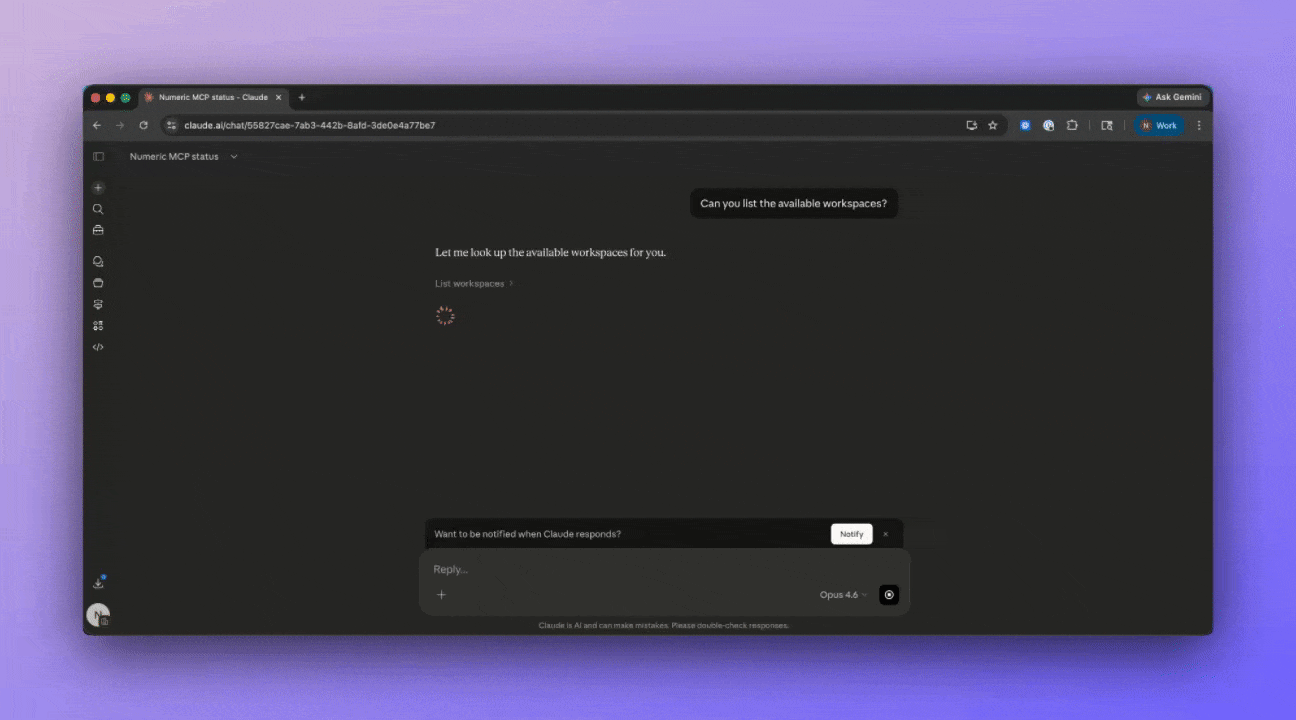 At the most basic level, Claude becomes a natural language interface to your Numeric workspace.