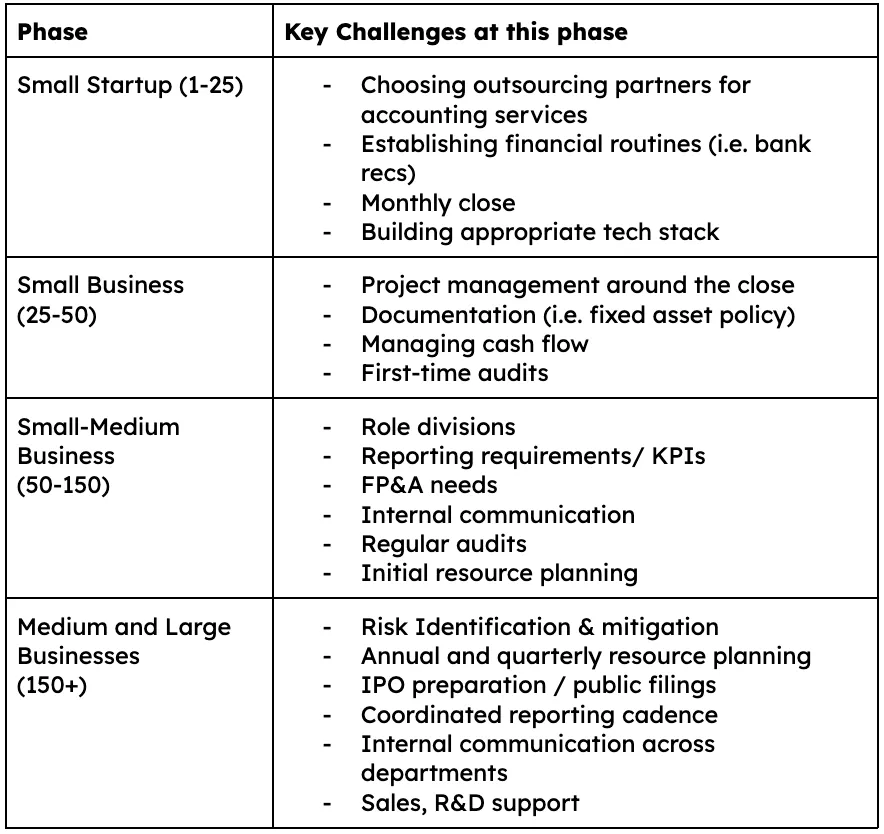 And then as you scale up, demands grow. Teams begin to focus on professionalizing, including budgets and processes. They start monitoring metrics, and reporting and analysis become integral to operations. In general, once you move past the bookkeeping and outsourced accounting phases, the focus becomes:
