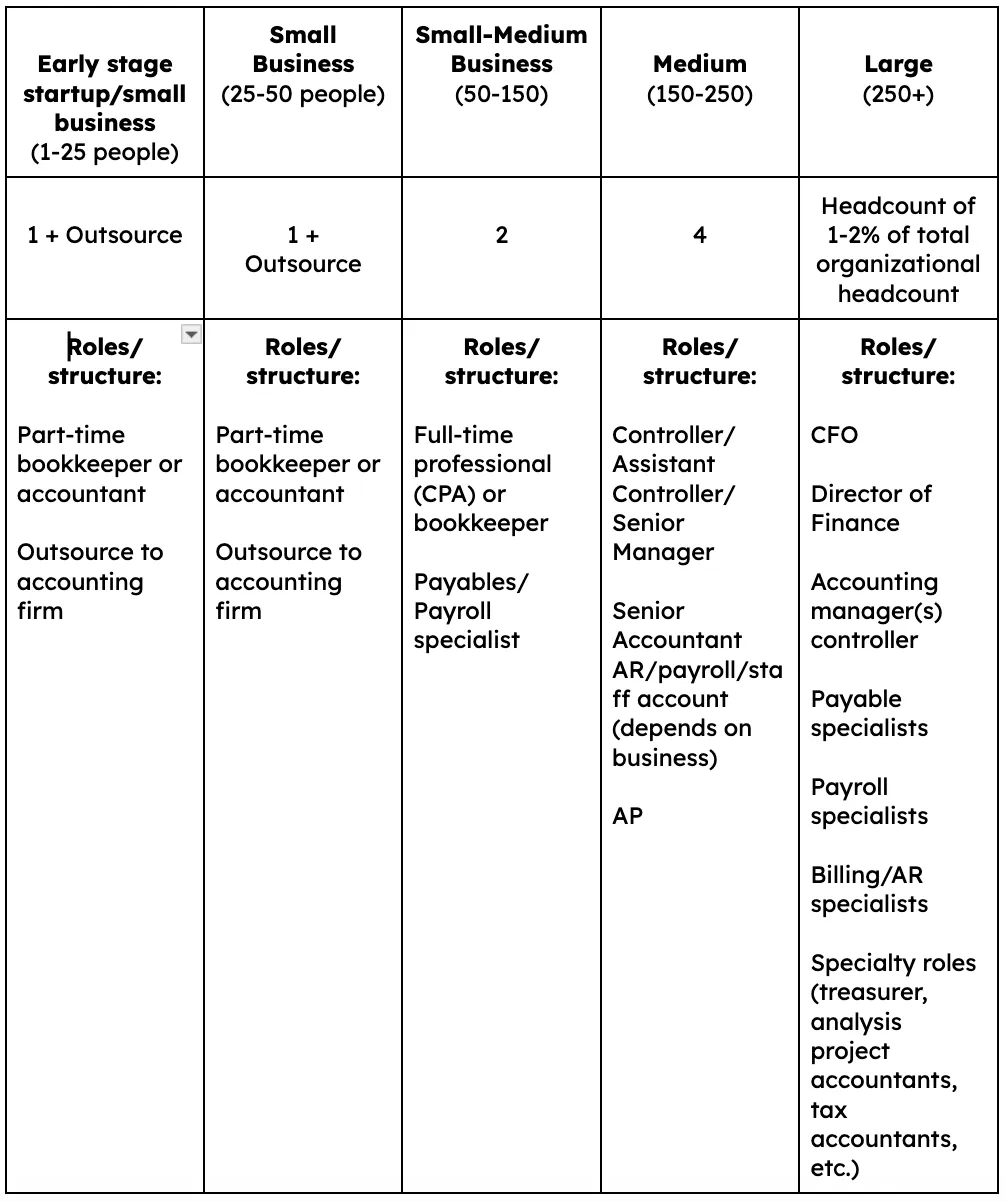 The size of your finance and accounting team varies substantially by business. For example, industries with more compliance and regulation, like Fintech or MedTech, may demand higher headcount from the start. However, in general, you can expect something along these lines—