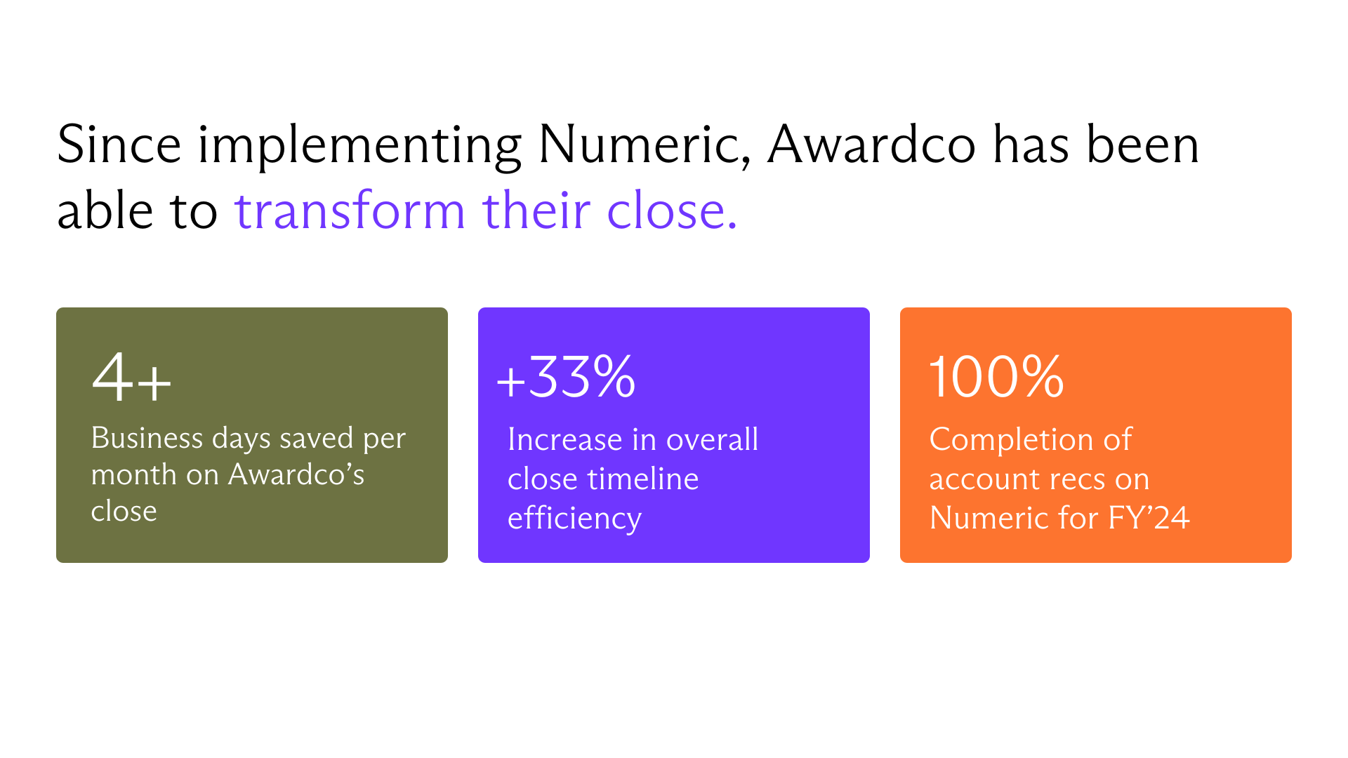 Awardco’s accounting org was contending with manual close challenges and a key team transition. With Numeric, they shaved four days off their close, improved FP&A collaboration with real-time monitors, and boosted efficiency with AI-powered tools—all while maintaining a lean team.