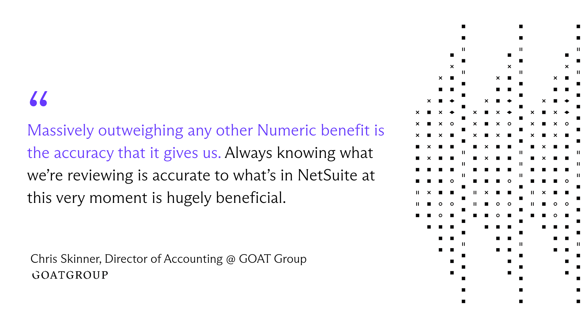 "Massively outweighing any other Numeric benefit is the accuracy that it gives us," notes Skinner. "Always knowing what we're reviewing is accurate to what's in NetSuite at this very moment is hugely beneficial."