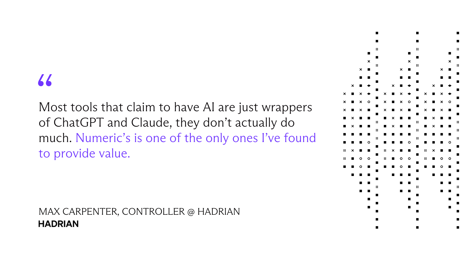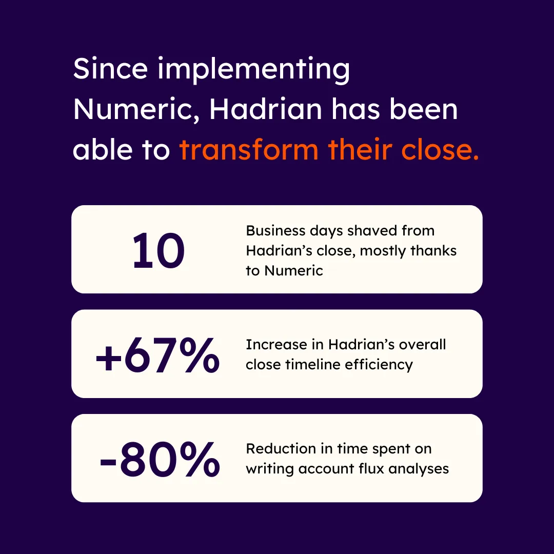 Hadrian's accounting function was starting from scratch with no reconciliations, minimal accruals, and a 15-day close process. With Numeric, they transformed their financial operations, cutting close time by 67%, supporting 4X revenue growth without adding headcount, and implementing GAAP-compliant processes that impressed Big 4 auditors.