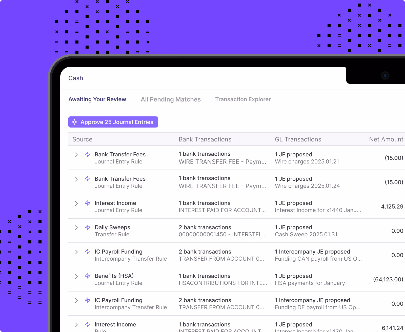 From routine cash transfers to complex inter-company transactions, Numeric automatically posts journal entries to NetSuite in batches — reducing manual work and errors.