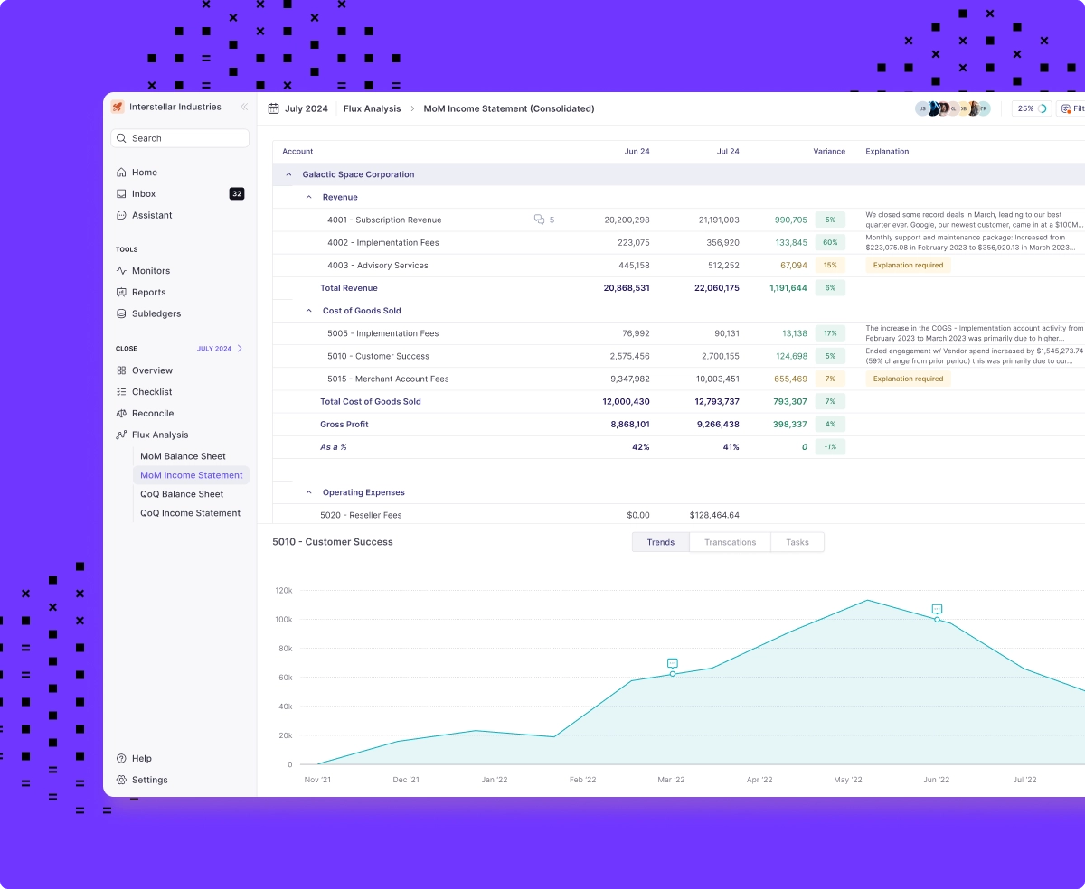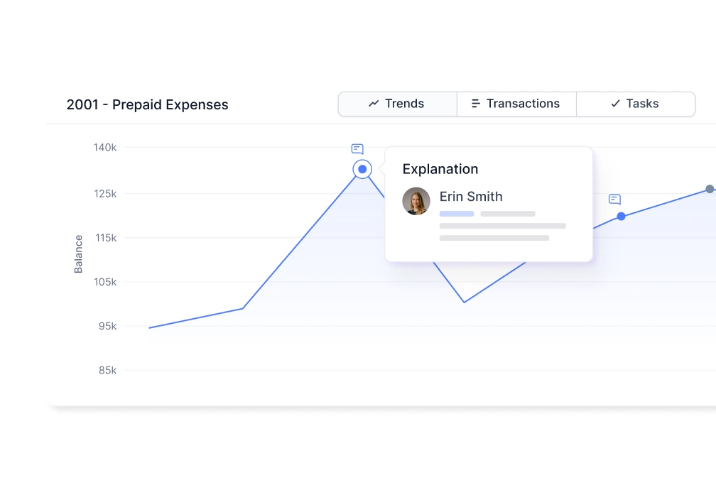 Easily view account trendlines and prior-period explanations to quickly understand shifts in your financials and inform explanations.